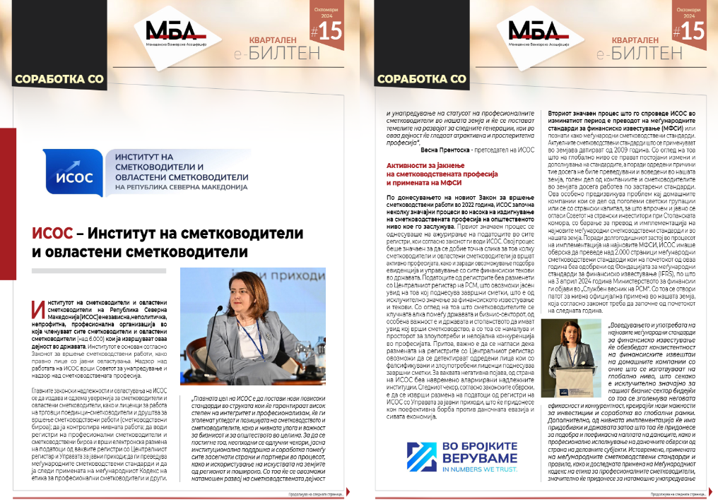 Во најновиот број на Билтенот на Македонската банкарска асоцијација беа претставени активностите и заложбите на Институтот на сметководители и овластени сметководители.